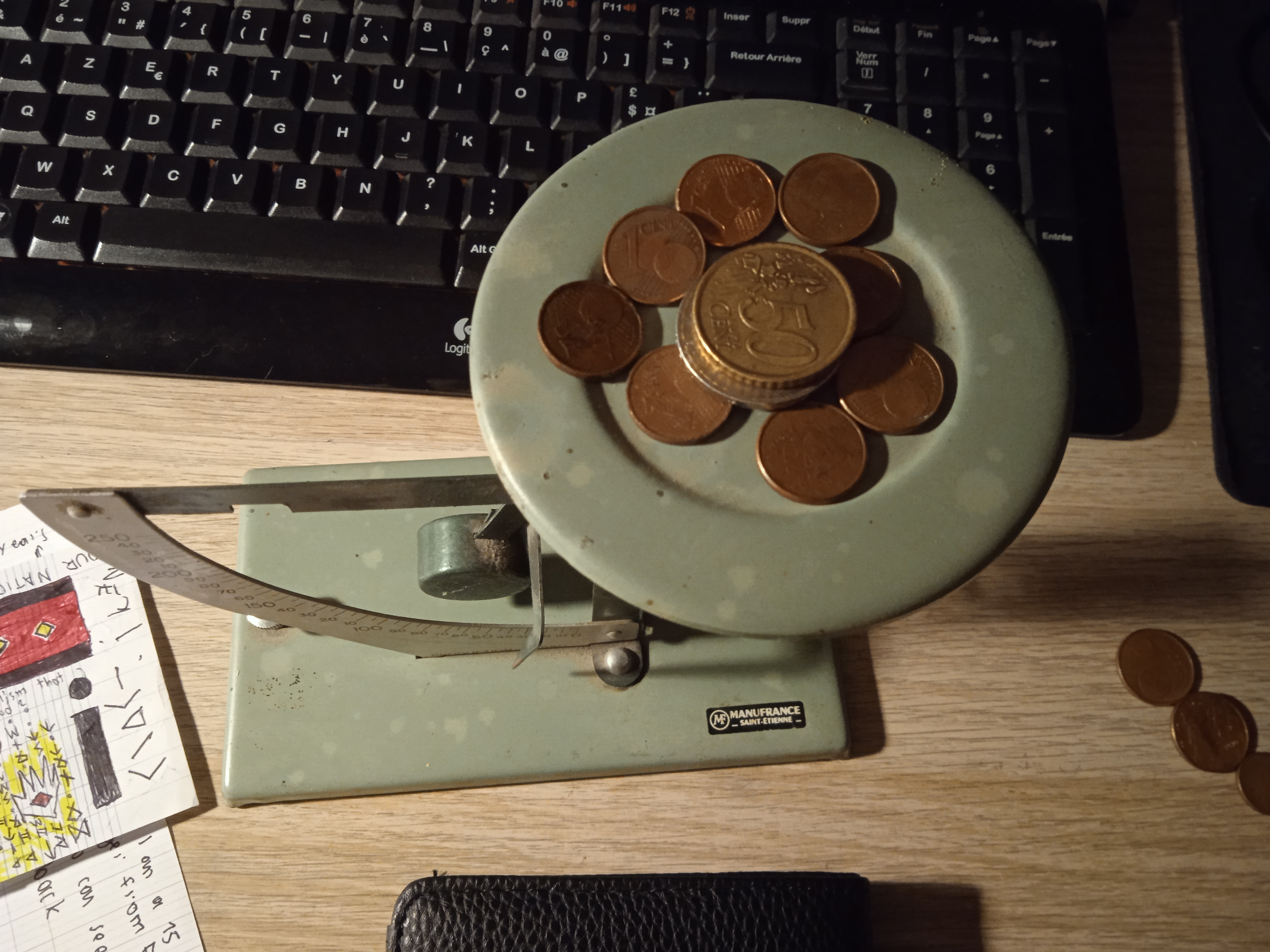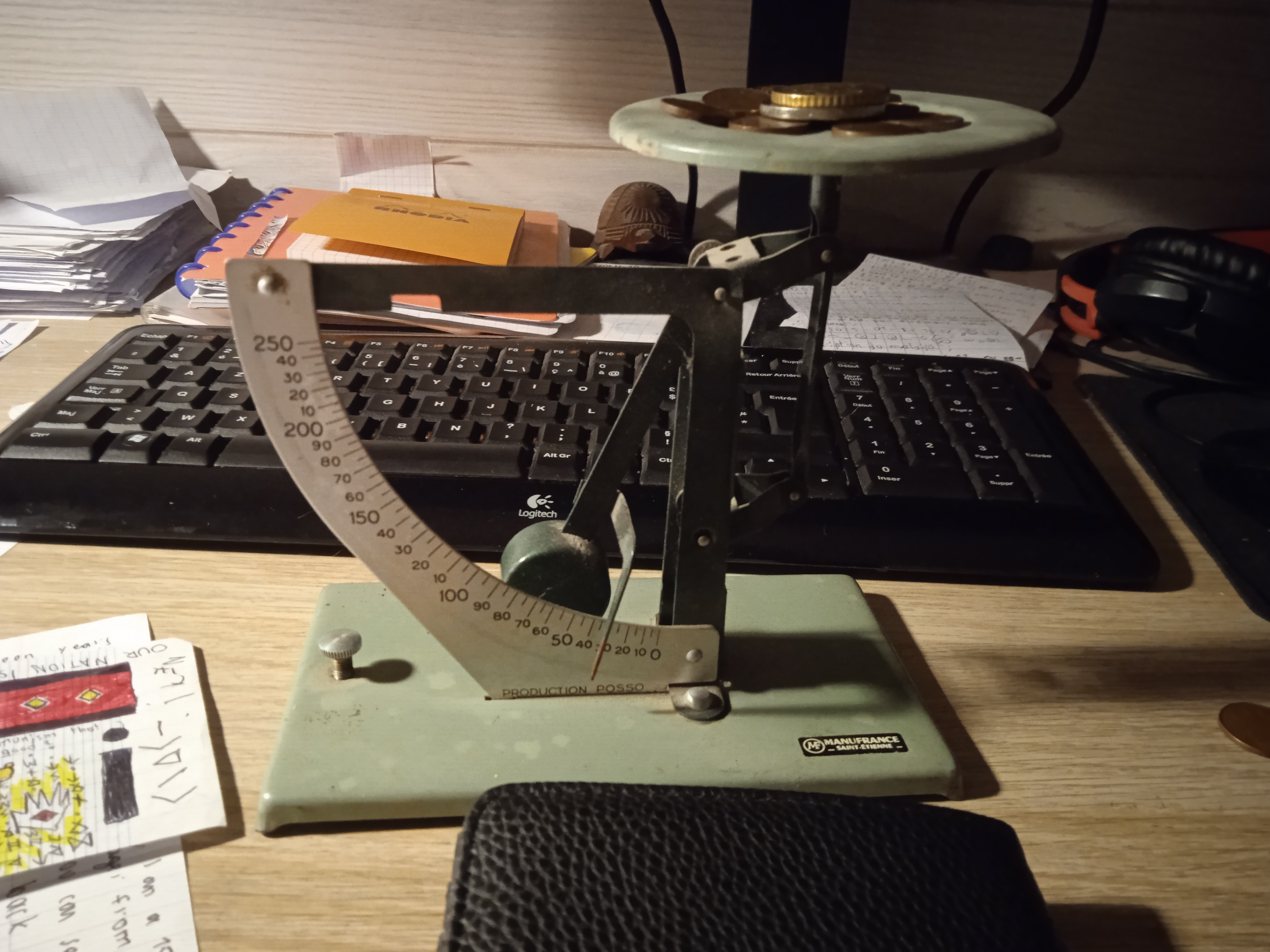 as I feared that the whole DIY postcard could be somehow more than 20g, over which more than one stamp is required, I weighted it… with a dedicated device that is called „pèse-lettre“ in French.