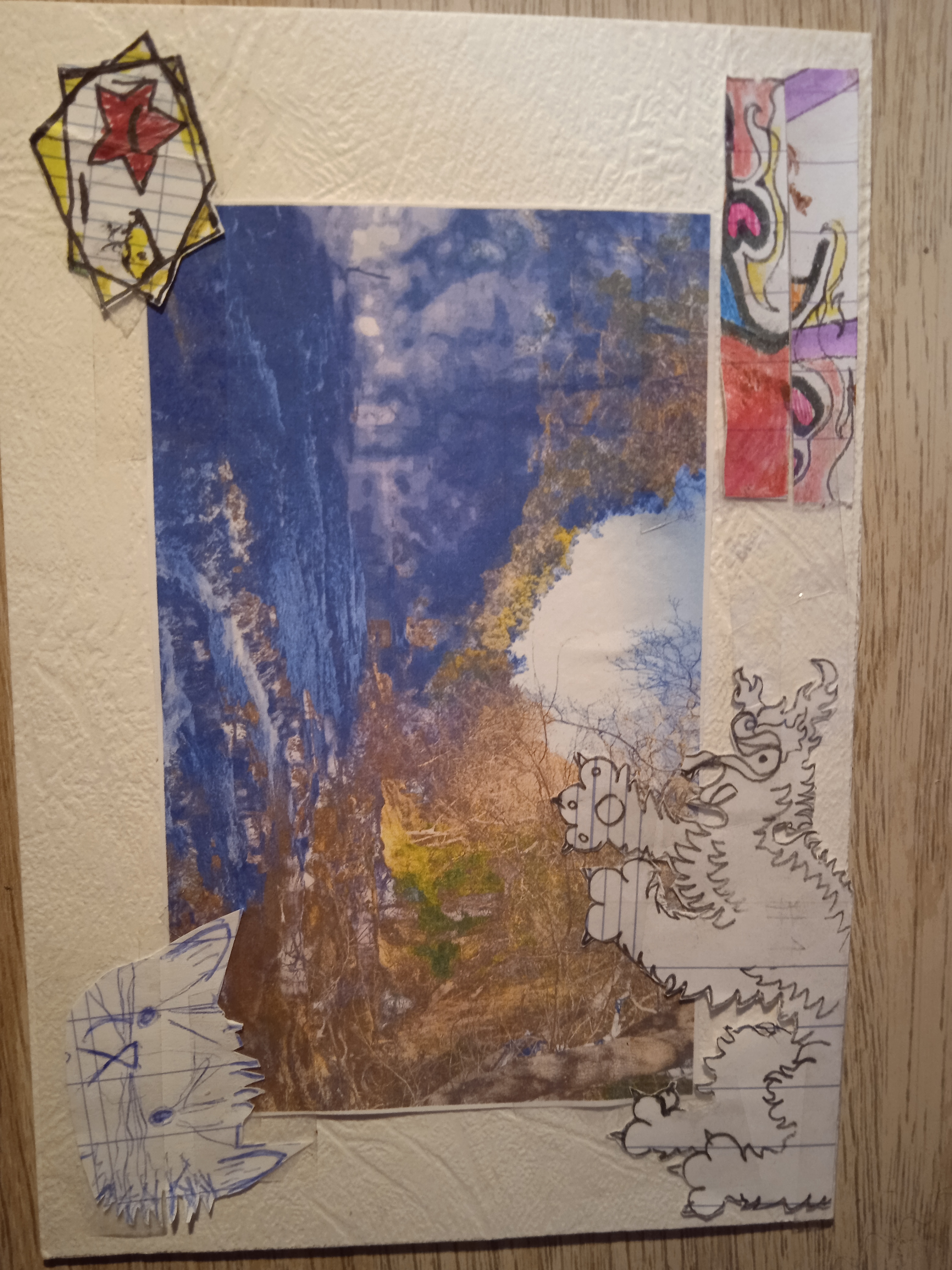 that collage was composed of a a picture of a river near which I live that I had taken with my smartphone and that I printed with a printer, accompanied by some cut out pencil drawings.